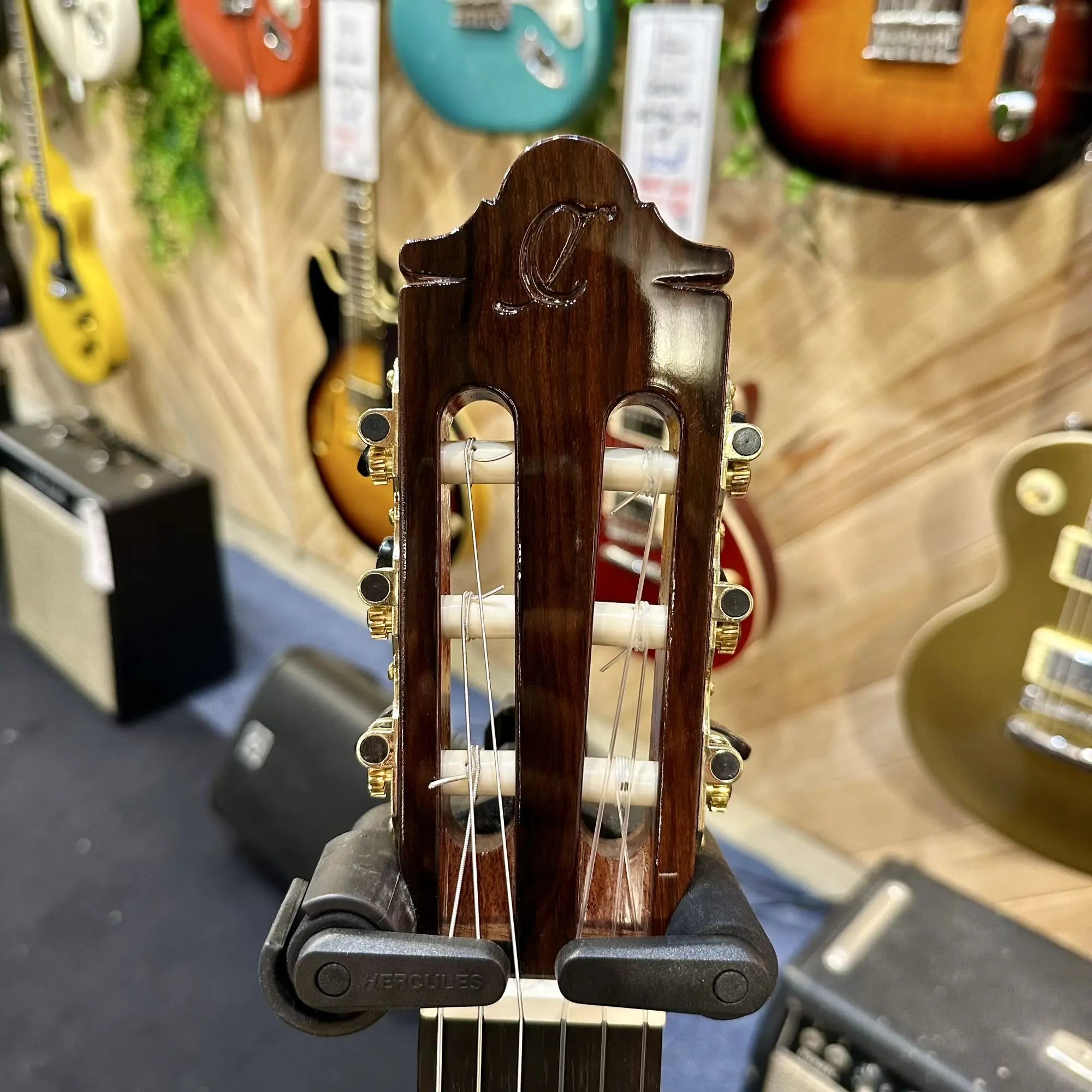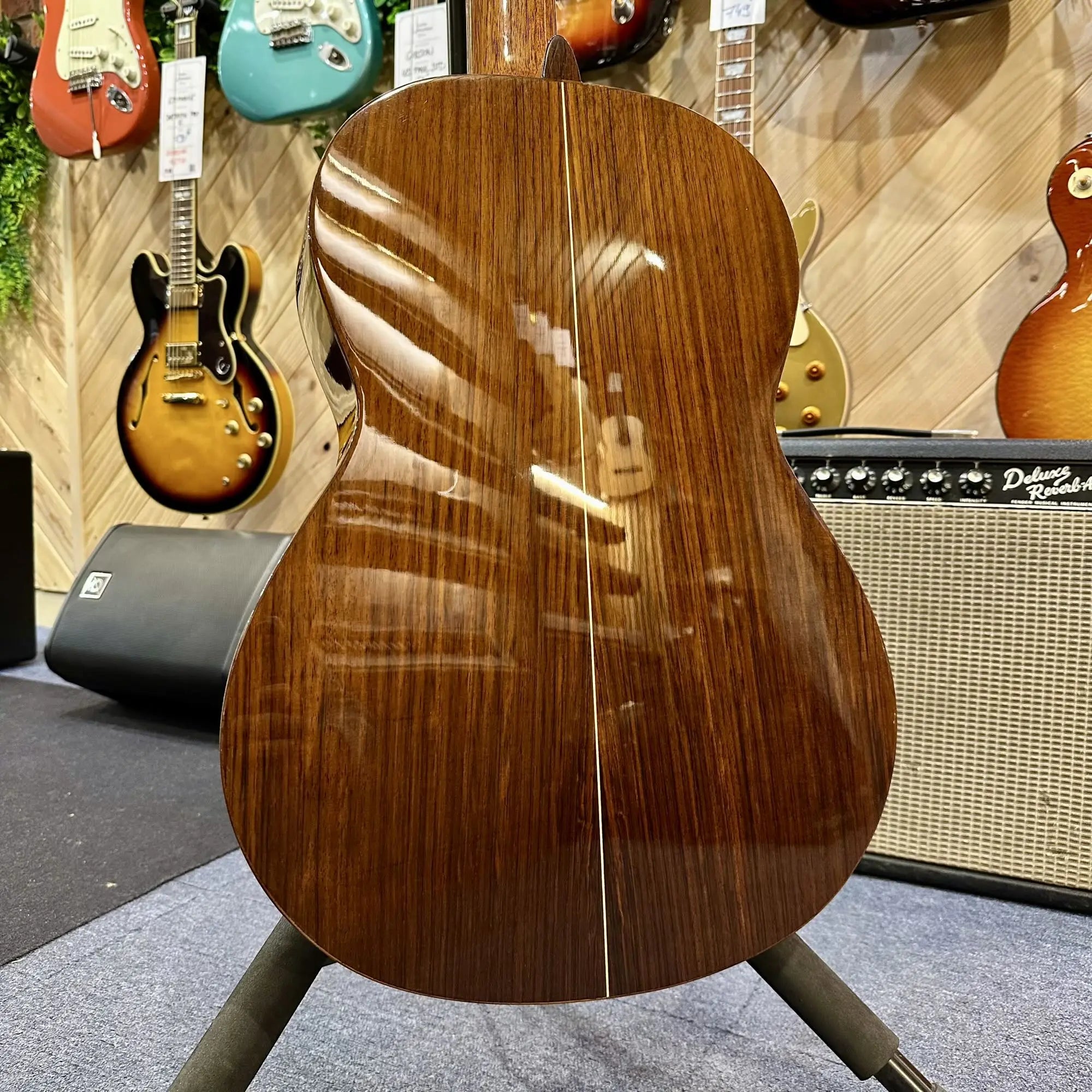 Sa table en cèdre massif apporte une chaleur immédiate et une belle richesse harmonique, tandis que le dos et les éclisses en palissandre offrent profondeur et définition. Le manche confortable assure une prise en main naturelle, idéale pour travailler la technique, les nuances et l’expressivité propres au répertoire classique.