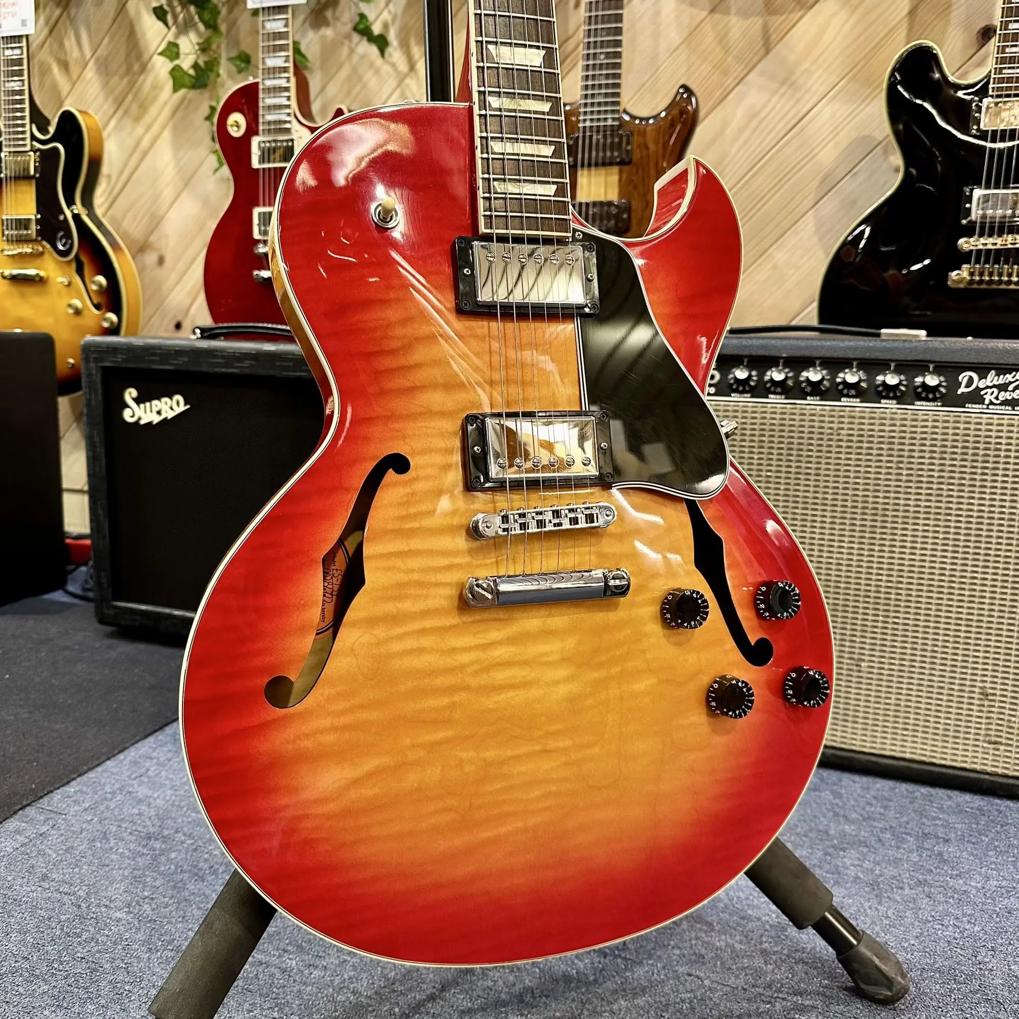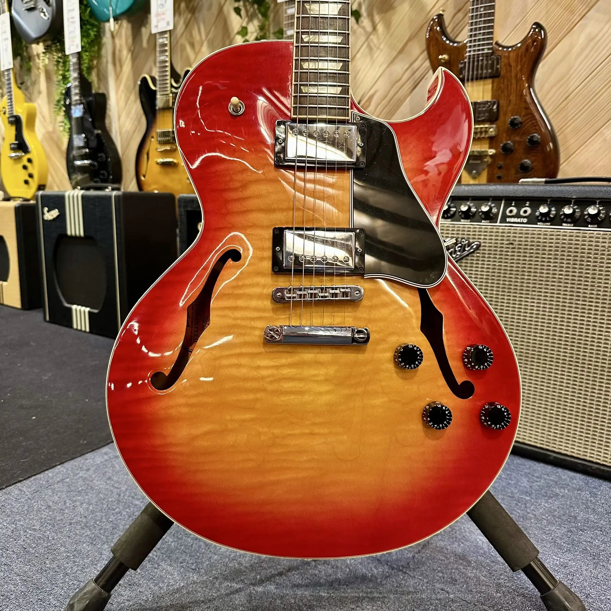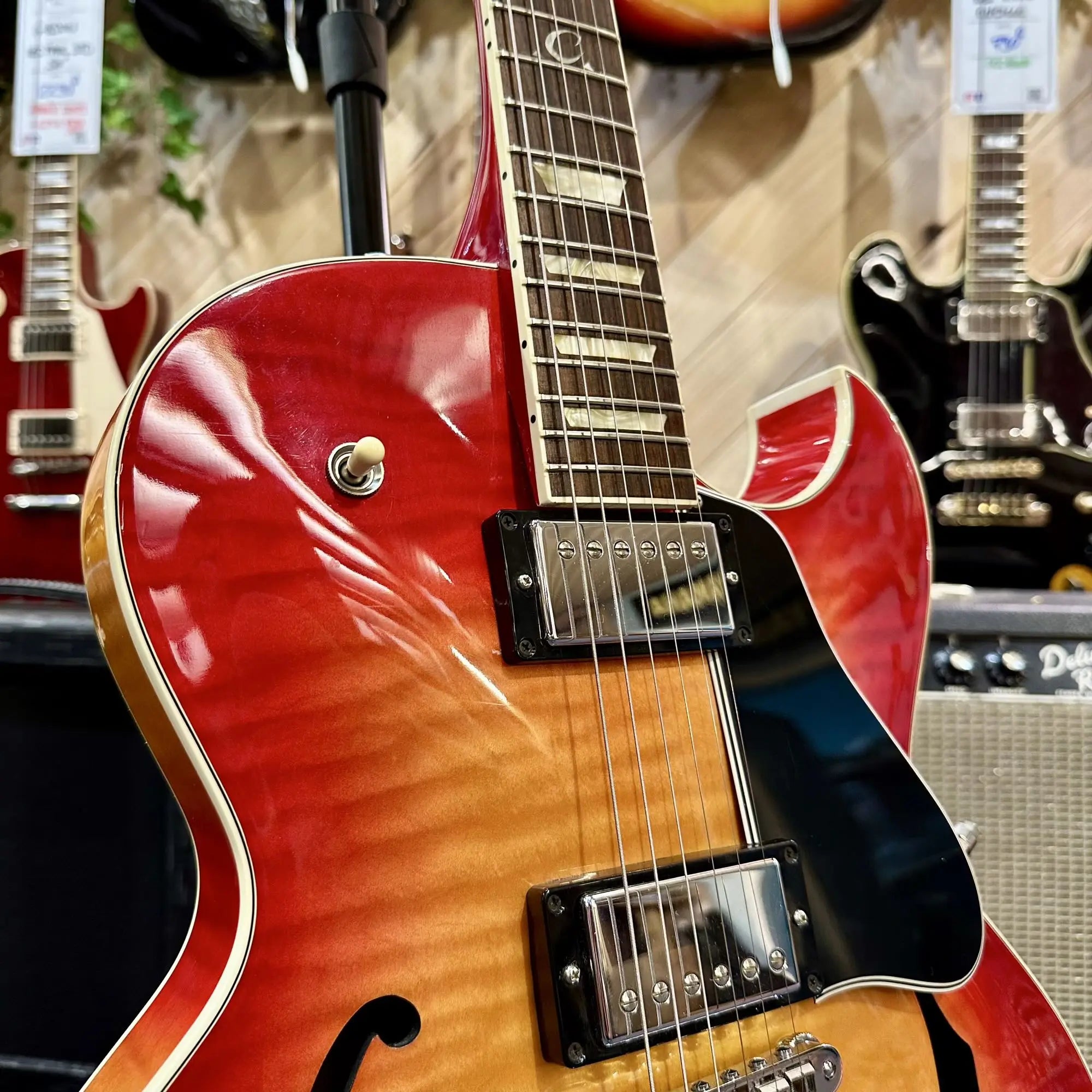 Son corps semi-hollow avec bloc central en acajou procure une belle profondeur sonore tout en maîtrisant le larsen, idéale pour le jazz, le blues ou le rock élégant. Le manche confortable assure une jouabilité fluide et naturelle, tandis que les humbuckers Gibson délivrent un son riche, rond et articulé, capable de passer d’un clean chaleureux à un crunch chantant avec beaucoup de musicalité.