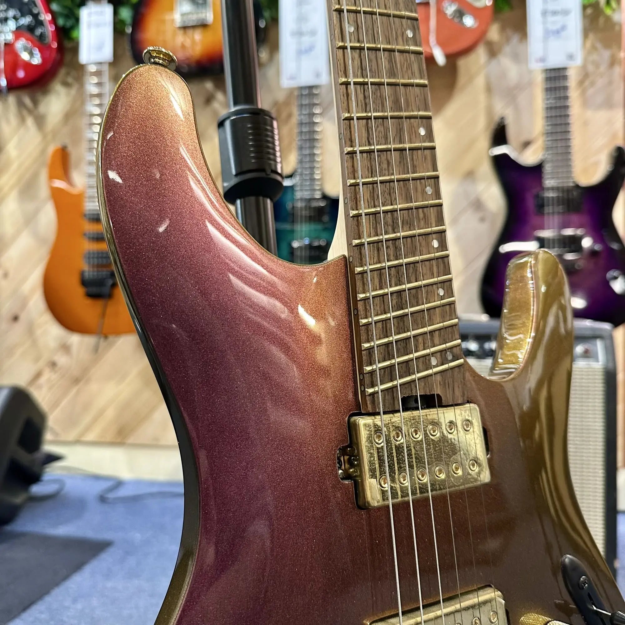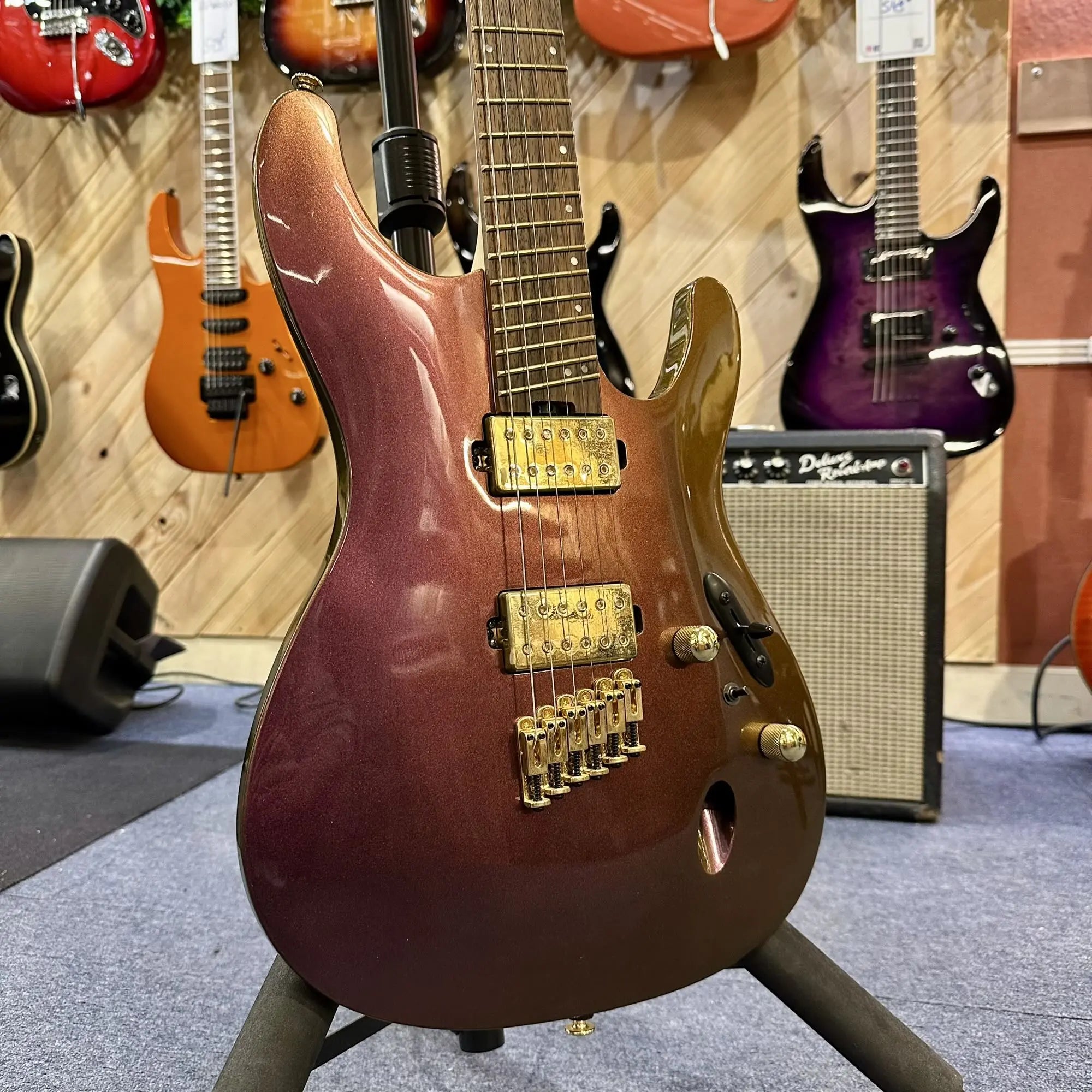 La finition RGC (Rose Gold Chameleon) apporte une identité visuelle forte et élégante, changeante selon la lumière, faisant de cette guitare un instrument aussi inspirant à jouer qu’à regarder.